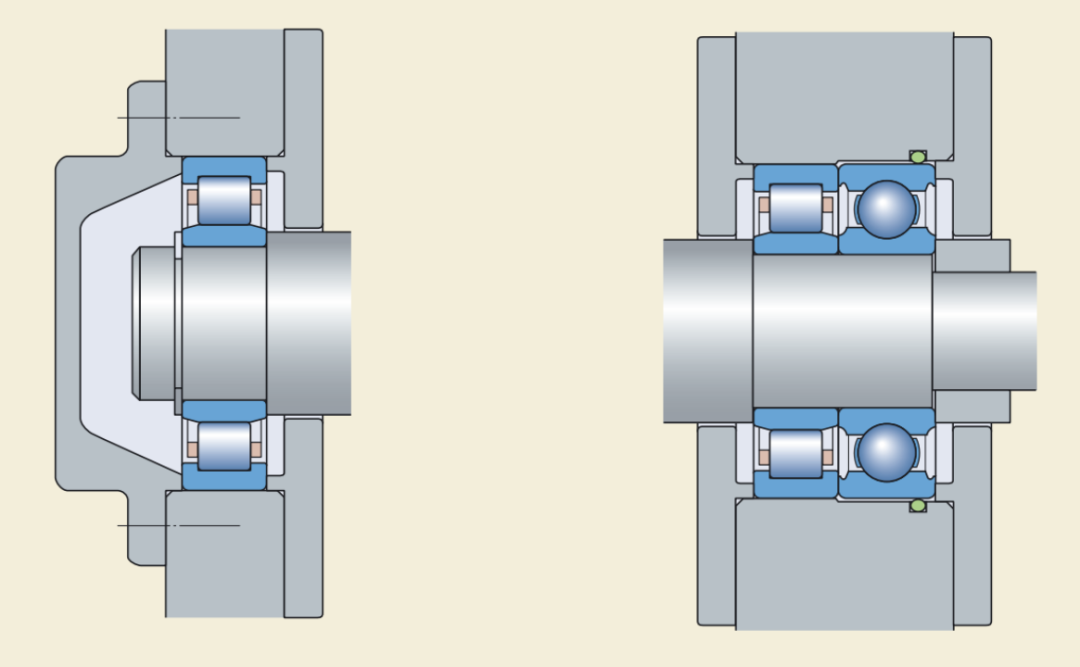 在电机轴承配置中,两柱一球结构是十分常见的电机轴系统轴承布置方式。顾名思义,两柱一球轴系统的布置中采用两个圆柱滚子轴承和一个球轴承构成。从轴系统定位的角度来看,两柱一球结构属于定位端加非定位端结构。 在电机中,最常用的圆柱滚子轴承类型是NU和N系列的圆柱滚子轴承,这类型的圆柱滚子轴承都不具备轴向负荷承载能力,因此只能做非定位端轴承。在两柱一球结构的系统中,因为球轴承具有一定的轴向负荷承载能力,因此他在整个系统中作为定位端轴承存在。 两柱一球结构主要是用于承载轴系统中较大的径向负荷的情况,这种情况下,使用两个深沟球轴承已经无法满足径向负荷要求,因此用两个圆柱滚子进行替代。但是圆柱滚子轴承没有轴向负荷承载能力,因此引入一个深沟球轴承进行定位,最终形成了两柱一球结构。下图为一种两柱一球结构的电机轴承布置图: