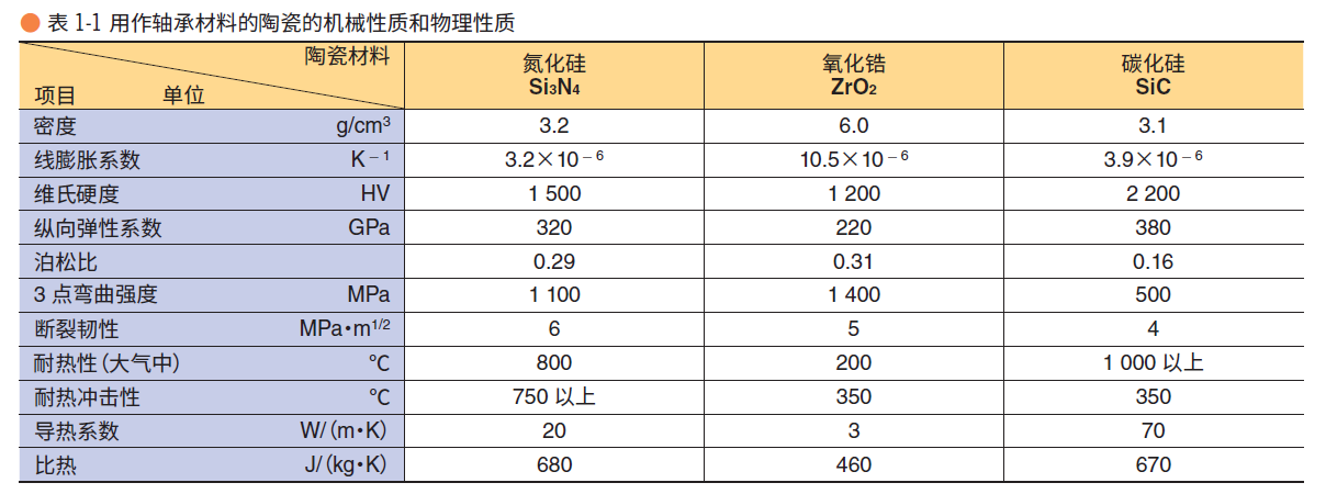 使用陶瓷材料的陶瓷轴承具备非磁性、绝缘体等普通轴承没有的物理特性,因此可用于与以往不同的新用途。 此外,高耐热性使滚动轴承可在高温下使用,低密度特性使轴承滚动体(球或滚子)的离心力变小,在机器的高速化中发挥了出色的效果。 一、陶瓷的材料特性 作为主要用作轴承材料的陶瓷,其机械性质和物理性质如表 1-1 所示,