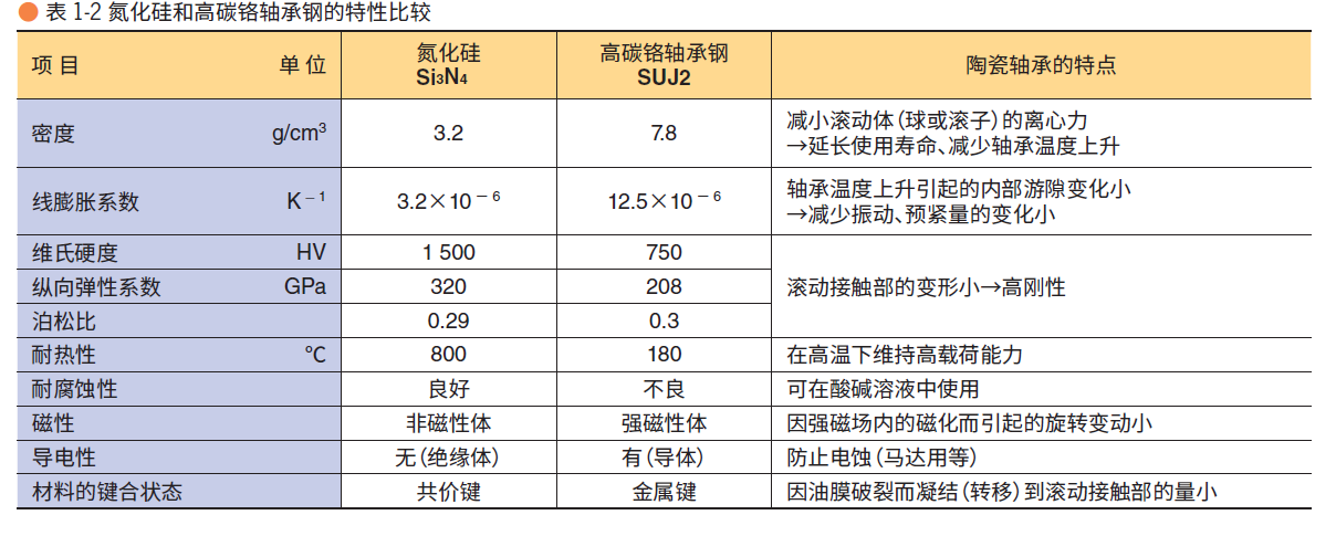 氮化硅和高碳铬轴承钢的比较如表 1-2 所示。