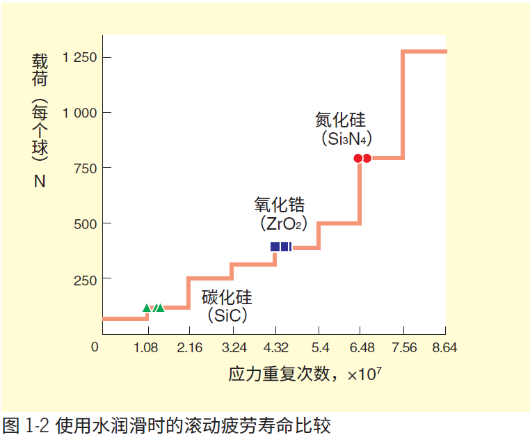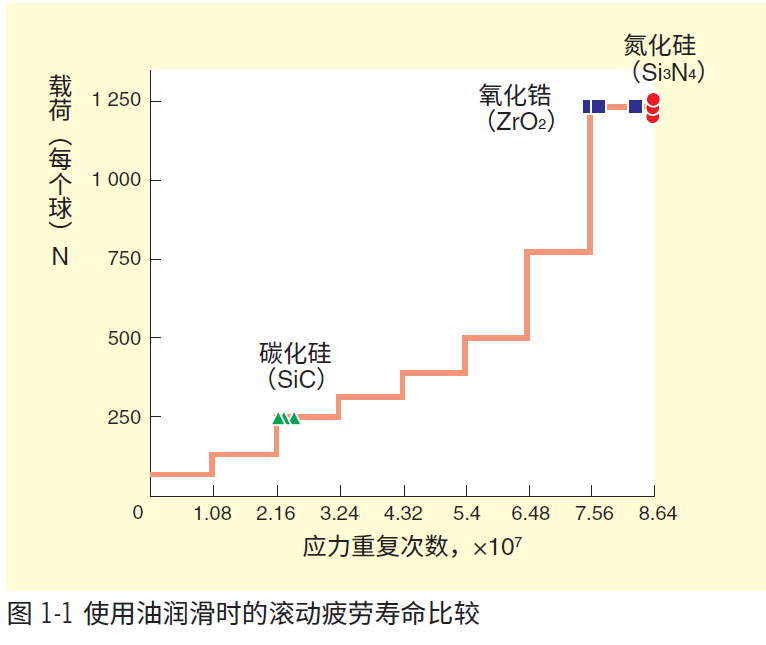 二、陶瓷的滚动疲劳 为评估各种陶瓷作为轴承材料时的性能,通过油润滑和水润滑两种方式进行了滚动疲劳试验,结果如图 1-1 和图 1-2 所示。结果表明,每种陶瓷材料的滚动疲劳强度基本是恒定的。同时,在进行了试验的材料中,氮化硅的性能最突出。
