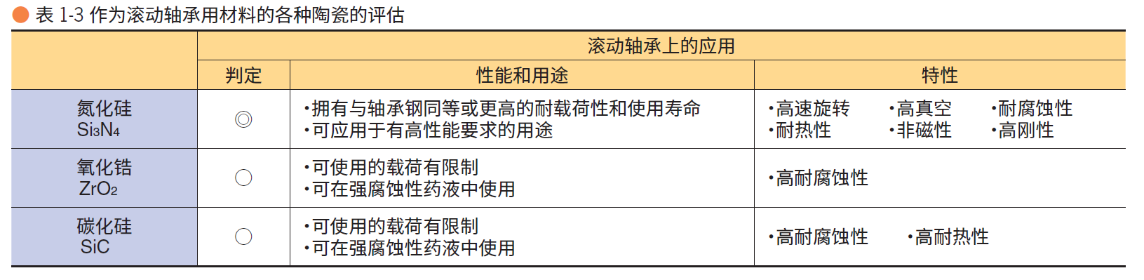三、适用于轴承的陶瓷 根据各种陶瓷的特性和滚动疲劳试验结果,作为轴承用材料的评估如表 1-3 所示。在所评估的陶瓷材料中,氮化硅可以说是最出色的滚动轴承用材料。